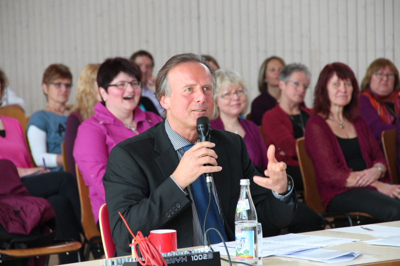 Nach 24 Jahren in Funktion des stellv. Kreischorleiters und nach 14-jähriger erfolgreicher Arbeit im Musikausschuss wurde Friedemann Buhl unter großem Applaus der Delegierten verabschiedet. Die Laudatio hielt Chorleiterkollegin Eva Sassenscheidt-Monninger (links) und Claudia Starke (rechts) dankte im Namen des Chorverbandes und überreichte ein Präsent.