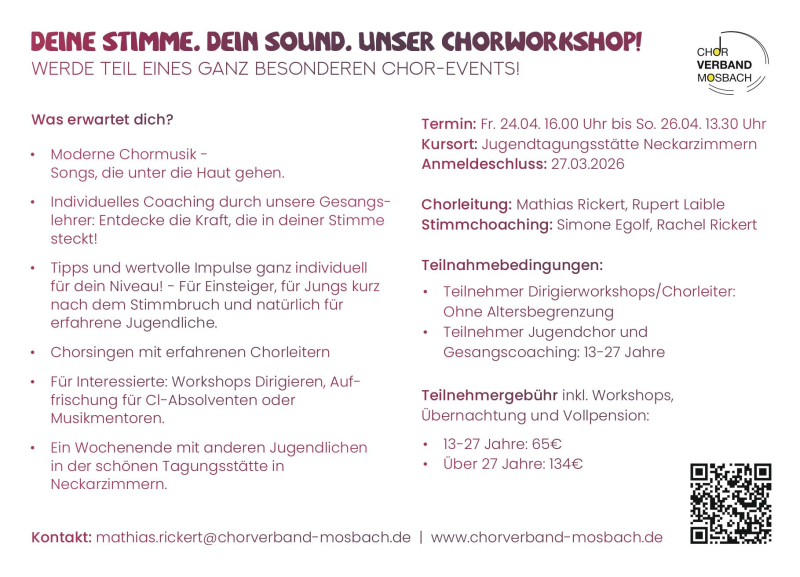 Die Anmeldungen zu den Workshops des Chorverband Mosbach wird in den nächsten 14 Tagen veröffentlicht.